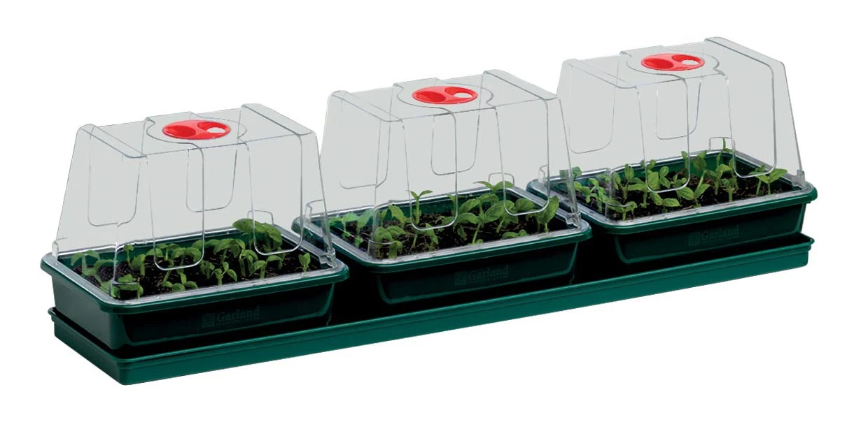 Das Garland 3-fach Zimmergewächshaus-Set für die Fensterbank passt perfekt auf die Fensterbank. Das Set besteht aus 3 Anzuchtschalen, die sich ideal für die Keimung von Samen oder die Bewurzelung von Stecklingen eignen. Es eignet sich auch perfekt für die Anzucht von Sprossen und Mikrogemüse. Der Deckel ist mit einer drehbaren Lüftungsöffnung versehen, die sich leicht öffnen und schließen lässt. Das ist sehr wichtig, denn für Setzlinge und Stecklinge ist eine konstante Luftfeuchtigkeit von ca. 60-80 % und eine Temperatur von 20-25 °C erforderlich. Der Boden hat Löcher auf zwei Ebenen. Die Zimmergewächshäuser werden in einen Bodenbehälter gestellt, der mit einer Kapillarmatte versehen ist, die es den Sämlingen, Stecklingen oder Mikrogemüse ermöglicht, Wasser durch die Löcher im Boden der Zimmergewächshäuser aufzunehmen. Das Zimmergewächshaus hat einen extra hohen Deckel, damit die Sämlinge oder Stecklinge genügend Platz zum Wachsen haben.
