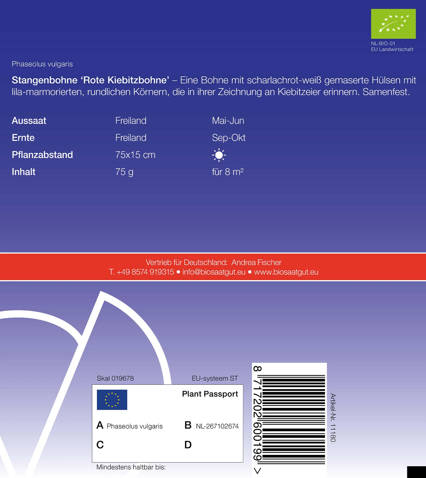Eine Bohne mit scharlachrot-weiß gemaserten Hülsen mit lila – marmorierten, rundlichen Körnern, die in ihrer Zeichnung an Kiebitzeier erinnern. Samenfest.