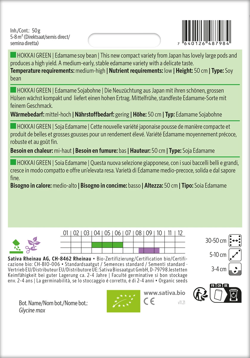 Die Neuzüchtung aus Japan mit ihren schönen, grossen Hülsen wächst kompakt und liefert einen hohen Ertrag. Mittelfrühe, standfeste Edamame-Sorte mit feinem Geschmack.