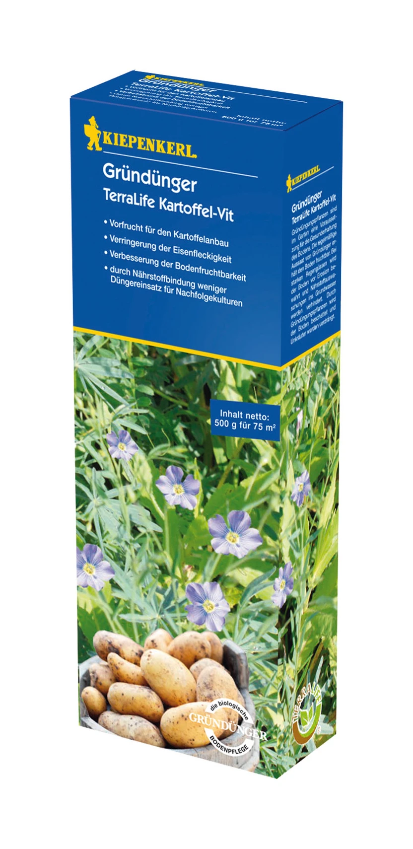 Schnelle Bodenbedeckung und Vitalisierung des Bodens. Terra Life Kartoffel-Vit ist eine ausgewogene, speziell für den Kartoffelanbau abgestimmte Mischung, die schnell den Boden beschattet, für eine gute Durchwurzelung sorgt und die Bio-Diversität erhöht. Die Bitterlupine reduziert wie keine andere Pflanzenart den Befall mit Tabakrattle-Viren, die bei der Kartoffel die Eisenfleckigkeit auslösen können. Die Sommerwicke wirkt positiv auf Bodenbakterien, die die Pflanzen vor potentiell krankmachenden Bakterien schützt. Die Mischung friert über den Winter sicher ab und kann damit leicht eingearbeitet werden. 500 g reicht für 75 m²